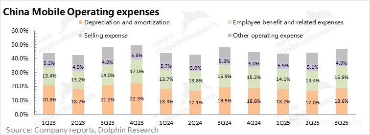 中国移动 2025 年第三季度经营费用 1181 亿元,同比增长 0.5%,保持平稳。海豚君将 “销售费用”、“雇员薪酬费用”、“折旧及摊销” 和 “其他营运支出” 四项都放在经营费用中;