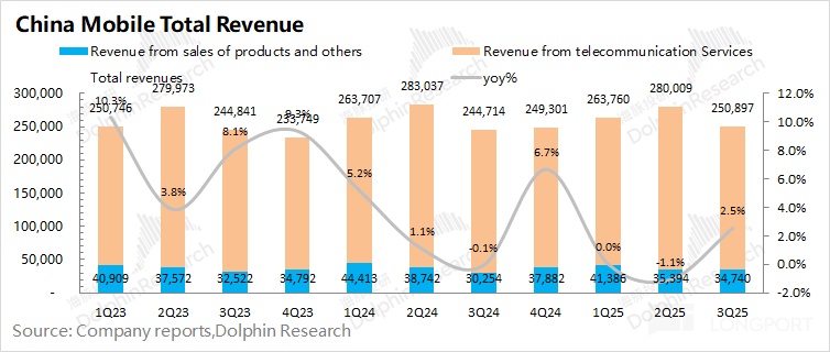 中国移动 2025 年第三季度总营收 2509 亿元,同比增长 2.5%。分项来看,其中公司本季度来自于通讯服务的收入为 2162 亿元,同比微增 0.8%;来自产品销售及其他的收入为 347 亿元,同比增长 14.8%,是公司本季度增长的主要推动力。