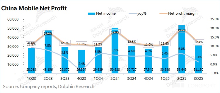 中国移动 2025 年第三季度净利润 312 亿元,同比增长 1.4%。公司本季度经营费用率的减少,抵消了毛利率下降的影响,最终带动了利润端的增长。