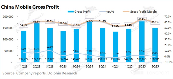 中国移动 2025 年第三季度毛利率 60.1%,同比下降 1.5pct。海豚君将 “网络运营及支撑成本” 和 “销售产品成本” 列为营业成本,进而测算公司毛利及毛利率情况。