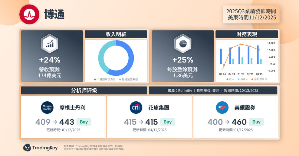 本周四,博通将公布2025财年第三季度业绩,市场目光聚焦于此。华尔街的预期已然高涨:普遍预测其营收将达到174亿美元(同比增长24%),每股收益为1.86-1.87美元(同比增长25%)。如果这些数据得以实现,这可能标志着该公司有史以来最强劲的季度。