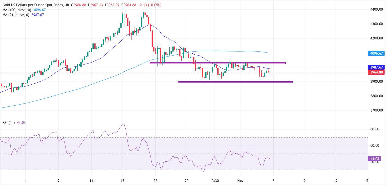 黄金在4小时图上仍被困于4050美元和3900美元之间的狭窄区间,反映出交易者的犹豫。短期偏向略显看跌,因为该金属继续在接近3990美元的21期简单移动平均线下方交易,这限制了立即的上涨尝试。要实现更强劲的反弹,需要突破前支撑转为阻力的区域在4020-4050美元,以吸引新的买盘兴趣。