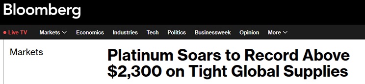 铂金广泛用于汽车及珠宝行业,今年涌入贵金属的投资浪潮也推升了其价格。黄金和白银同样刷新纪录。