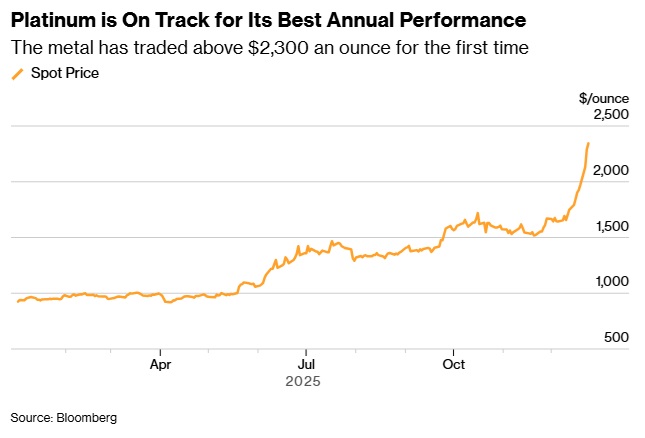 24K99讯 美国彭博社周三(12月24日)报道称,铂金价格周三飙升至历史新高,在供应趋紧且借贷成本处于历史高位的背景下,这一贵金属价格首次升破2,300美元/盎司。