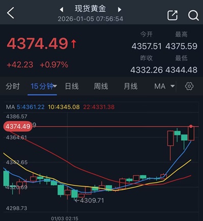 现货黄金价格高开逾25美元,目前金价最高触及4375.59美元/盎司,日内涨幅达到42美元。现货白银大涨2.2%。铂金和钯金也走高。