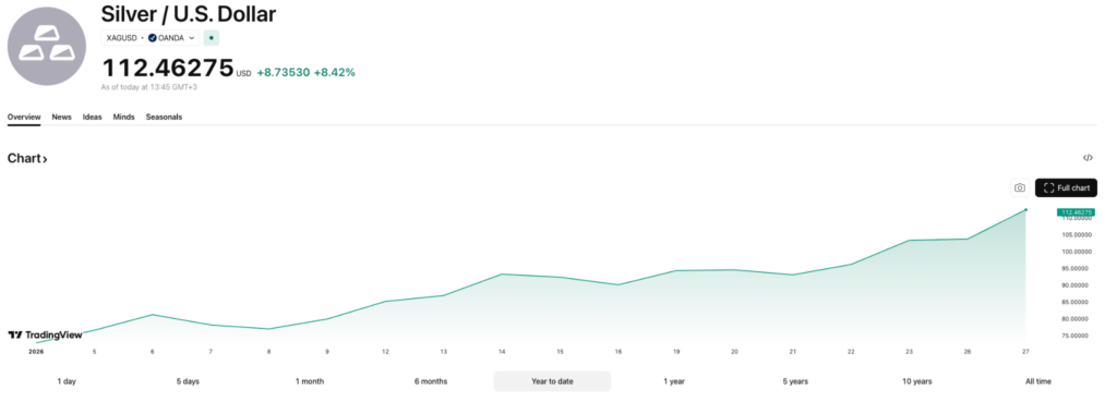 在此背景下,这位专家提醒称,白银的极端上涨可能会使投资者面临显著的下行波动风险。值得注意的是,银价周二(1月27日)上涨超过8%,交易价格为112美元/盎司。