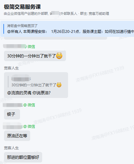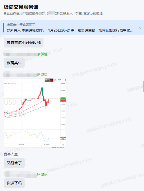 当下白银市场行情火热,一波强势上涨行情让不少投资者嗅到了财富机遇,而真正能精准把握、稳稳盈利的,往往是选对方向、跟对专业领路人的人。1月27日,《极简交易方法论》服务群里就迎来了一波盈利热潮,宽客老师带领群内同学果断做多白银,全员拿下丰厚盈利,更有同学精准切入,进场位置甚至比老师还要优质,群内一片喜报,盈利氛围拉满!