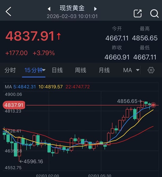 现货黄金目前位于4838美元/盎司附近;稍早金价一度触及4856.65美元/盎司,日内暴涨近196美元。金价此前在上一交易日下跌近5%,延续了上周五的跌势,而上周五的跌幅为十余年来最大。