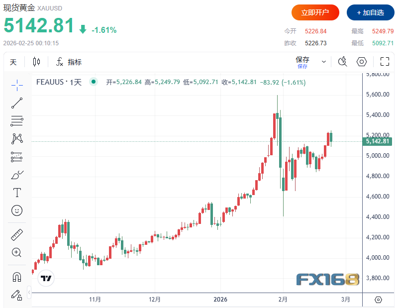 现货黄金现下跌1.6%,交投于5140美元/盎司上方,结束此前连续四个交易日的上涨势头,盘中稍早一度触及5092.71美元/盎司低点,较日高回落超157美元。