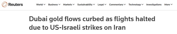 #伊朗危机追踪#24K99讯 英国路透社周日(3月1日)报道称,三位来自金属行业的消息人士透露,由于美国和以色列对伊朗的空袭以及德黑兰的报复行动,航空公司取消航班,迪拜贵金属交易中心的实物黄金进出流动将在接下来的几天内受到严重限制。