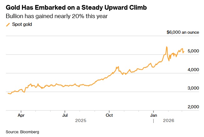 在地缘政治与贸易紧张局势升温,以及对美联储独立性的担忧支撑下,金价今年以来已上涨约20%。金价在1月下旬一度升至5595美元/盎司以上的历史新高。
