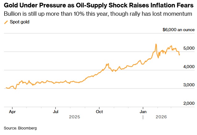 现货黄金价格在1月下旬曾触及5595美元/盎司上方的历史高点;自2月28日战争爆发以来,截至周三收盘,金价已下跌近9%。