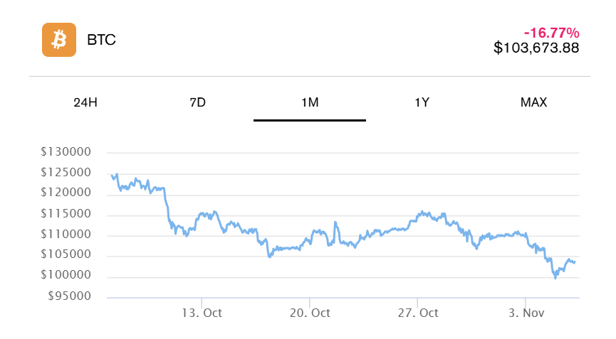 比特币自约四周前创下逾12.6万美元的历史新高以来,价格已下跌超过18%,本周一度短暂跌破10万美元。这轮抛售与宏观经济压力有关,尤其是美联储主席鲍威尔近期的鹰派言论,削弱了对比特币现货ETF的需求。