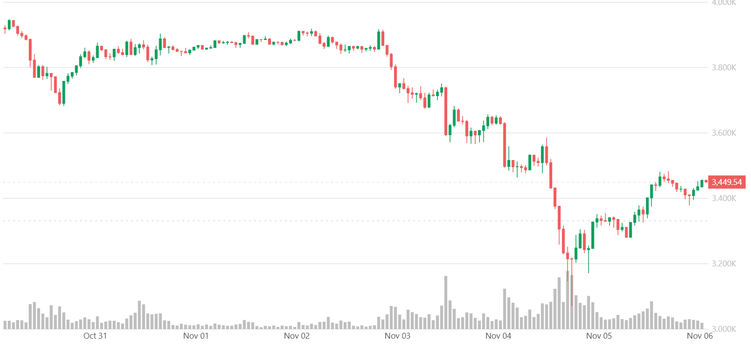 以太坊当前交易价格为3,439美元,较前24小时上涨5%以上,但过去一周累计下跌约13%。作为市值第二大的加密货币,它一直难以接近8月创下的4,946美元历史高点。