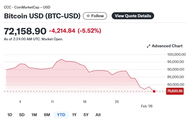#比特币最新消息#FX168财经报社(亚太)讯 雅虎财经报道称,周三(2月4日),比特币跌破73,000美元,在此前时段已走弱的基础上进一步扩大跌幅。此前,美国财政部长贝森特(Scott Bessent)暗示,美国政府不会对加密货币进行救助。