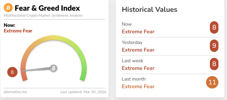 然而,整体风险情绪依然脆弱,加密市场的恐惧与贪婪指数周一回落至极度恐惧区,仅为8,显示市场情绪急剧恶化,投资者谨慎情绪上升。