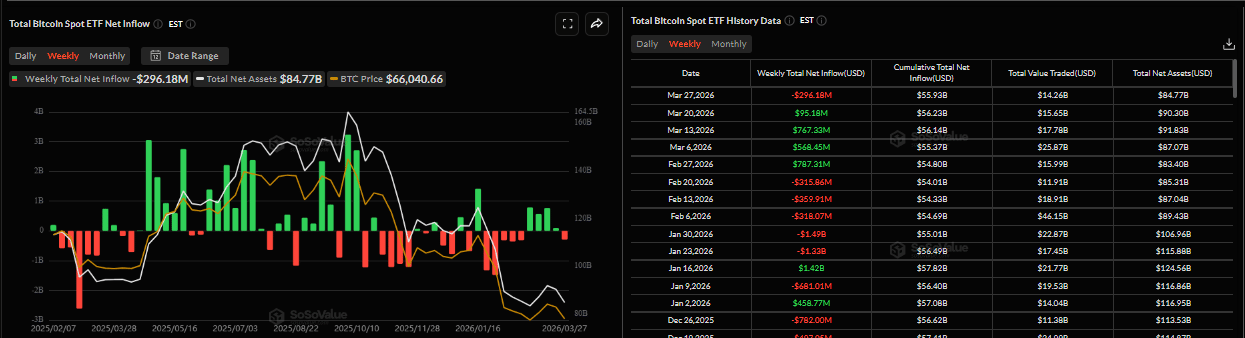 比特币的机构需求显现早期疲软迹象。下方SoSoValue数据显示,比特币现货交易所交易基金(ETF)上周录得2.9618亿美元的资金流出,打破了自2月底以来连续四周的资金流入。如果本周资金流出持续并加剧,比特币价格可能面临进一步调整。