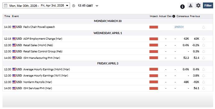 本周以美联储(Fed)主席杰罗姆·鲍威尔周一的讲话开场,可能为央行政策前景提供新线索。此外,关键美国数据包括自动数据处理公司(ADP)就业数据、供应管理协会(ISM)制造业和服务业采购经理人指数(PMI)以及3月非农就业报告(NFP)。交易者将评估利率路径及在战争不确定性加剧背景下的整体经济健康状况。