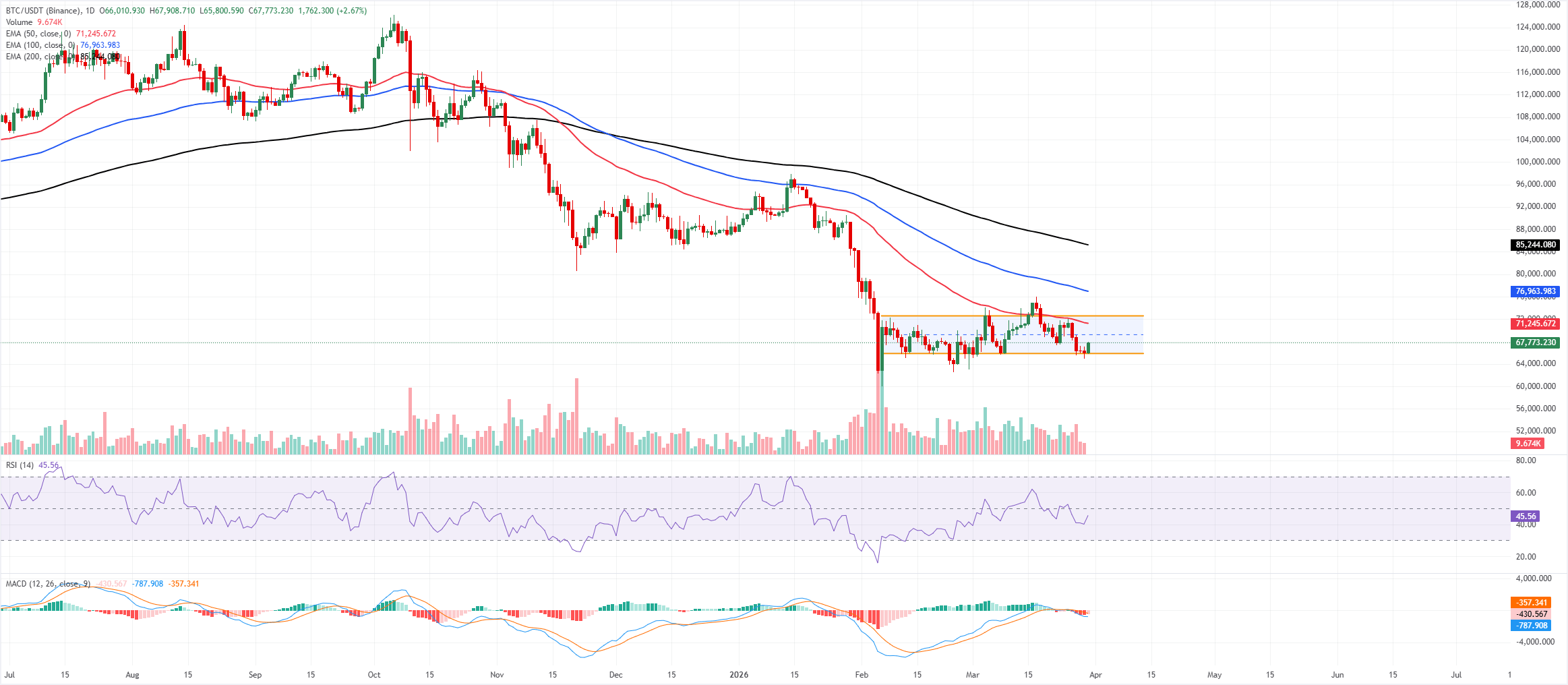 周一,比特币价格交易于67,500美元,继重新测试约65,900美元的横向通道下边界后小幅回升。短期偏向略显看跌,因50日、100日和200日指数移动均线均远高于当前交易价,凸显在更广泛的疲软结构中处于调整阶段。