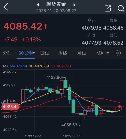 截至周三收盘,现货黄金仅上涨0.26%,报4077.93美元/盎司。金价盘中稍早曾涨逾1%。