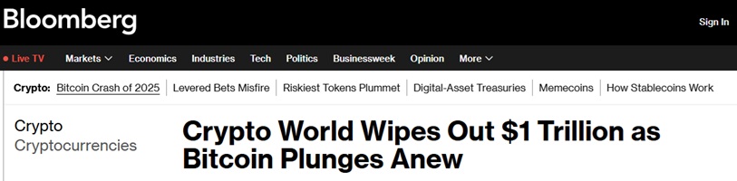#NFT与加密货币#FX168财经报社(亚太)讯 美国彭博社报道称,2025年的加密货币崩溃在周三(11月19日)进入新阶段,比特币跌至七个月来的最低水平,使数字资产领域的市值蒸发规模扩大至超过1万亿美元。