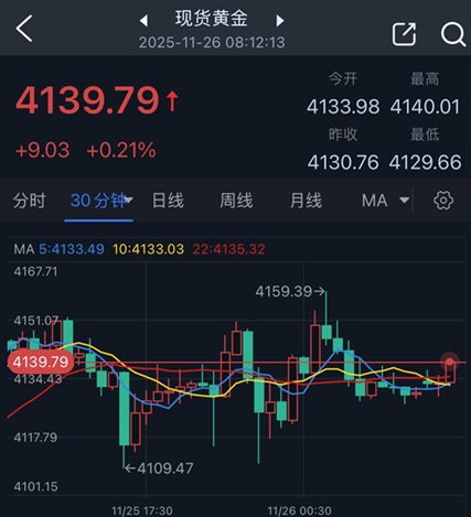 截至周二收盘,现货黄金报4130.76美元/盎司,日内微跌近0.1%。