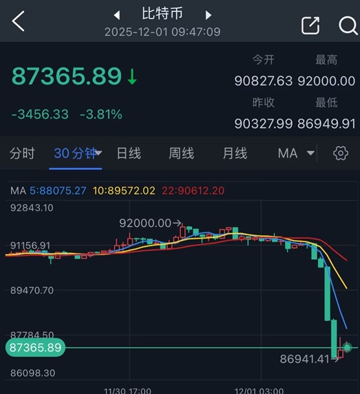 比特币在亚洲早盘一度下跌多达4.3%,跌破88,000美元;以太币暴跌6%,跌至2,900美元下方。