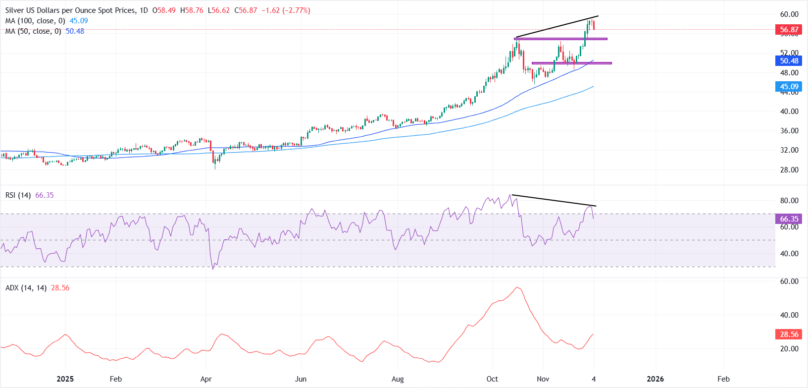 周四,白银(XAG/USD)在多头喘息并部分获利了结后走软,此前该金属在周三攀升至近58.98美元的历史高点。截至发稿时,XAG/USD交易约为56.85美元,日内下跌约2.75%。