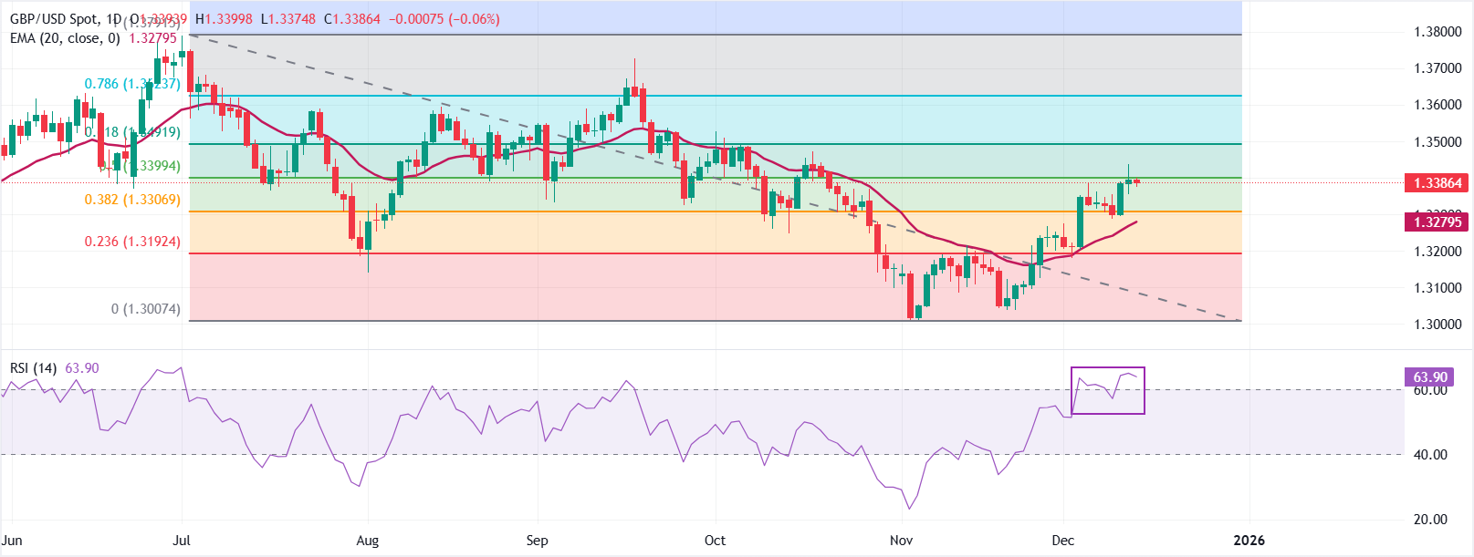 周五GBP/USD在1.3385附近平稳交易。20日指数移动平均线(EMA)已转向上方,价格保持在其上方,强化了短期上行偏向。
