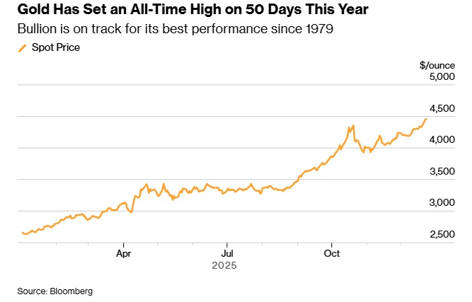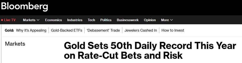 美国彭博社报道称,随着投资者在评估不断升级的地缘政治紧张局势以及美国进一步降息的前景,周二,黄金价格升至历史新高,这也是今年第50天刷新纪录。