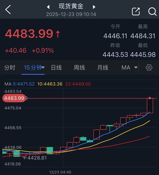 24K99讯 周二(12月23日)亚市早盘,现货黄金再度大幅攀升,金价刚刚触及4484.31美元/盎司,创下历史新高,金价日内飙升逾40美元。