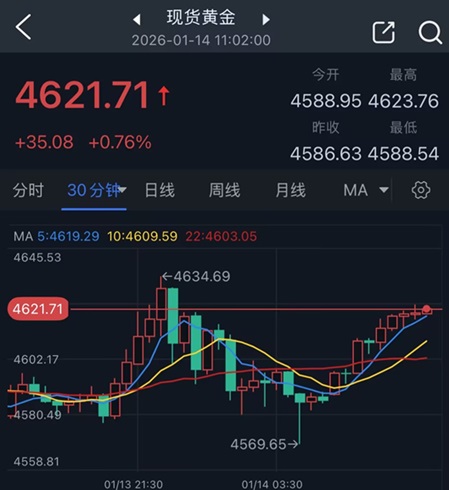 24K99讯 周三(1月14日)亚市盘中,现货黄金价格突然加速上涨,金价目前位于4622美元/盎司附近,日内大涨35美元,白银价格也暴涨并创下历史新高。