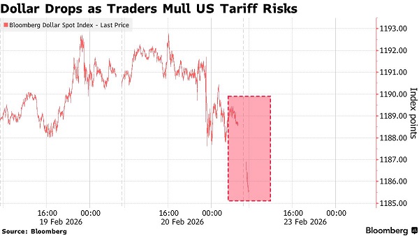 包括Kamakshya Trivedi在内的高盛集团(Goldman Sachs Group Inc.)策略师团队在一份报告中写道:“美元的普遍下跌可能反映出该裁决带来的新一轮政策不确定性。政策不确定性是影响美元的一个尤为重要的渠道,因为它可能对投资者和企业活动产生负面影响。”