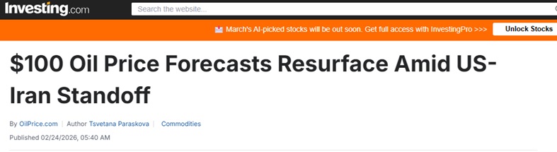 他补充称,如果中东地区的供应确实受到扰乱,油价升至每桶90至100美元“触手可及”,具体取决于事态严重程度。
