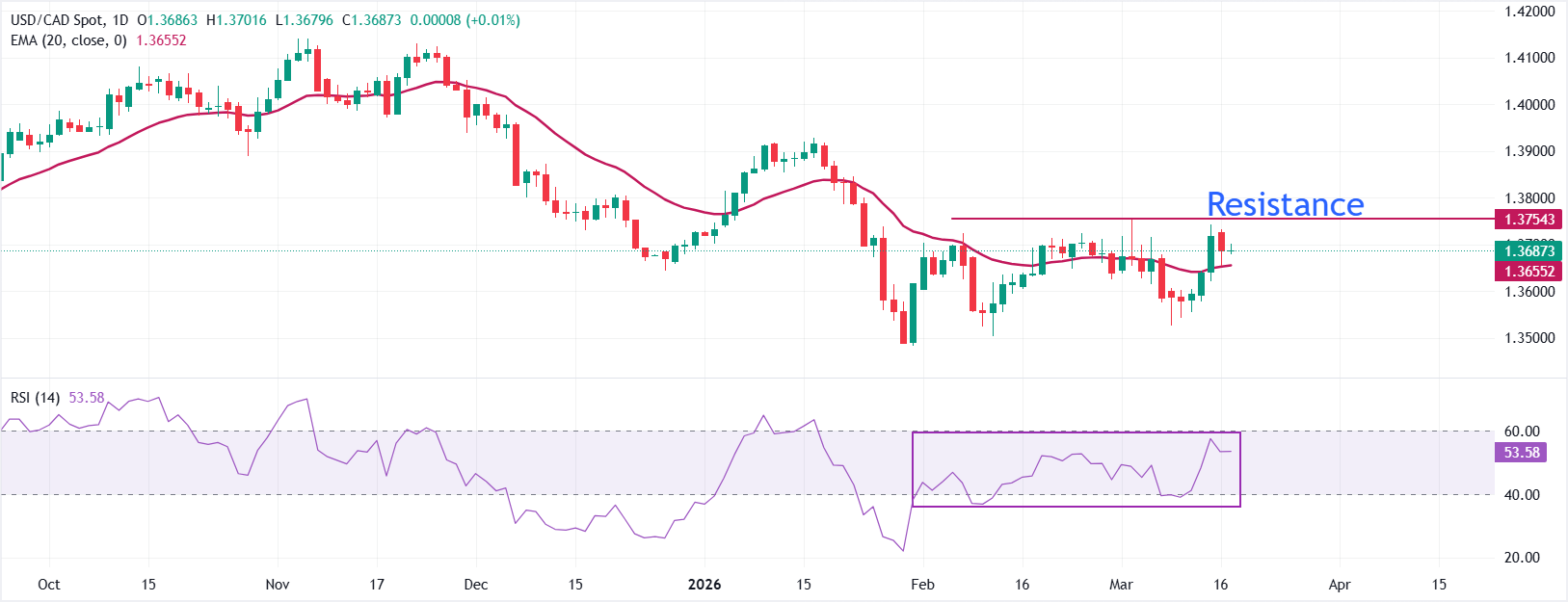 初步阻力位出现在1.3715,近期的波动高点限制了上涨,随后是3月3日的1.3750高点,若突破将成为更重要的障碍,打开通往1.3800区域的道路。下行方面,20日EMA附近的1.3655是直接支撑位,若跌破则将暴露1.3615,接着是1.3580区域,之前的低点汇聚在此,深度修正阶段将获得动力。