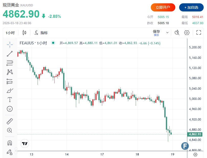 现货黄金周三一度跌逾3%,跌至一个多月来的最低水平4837.80美元/盎司,较日高回落近180美元;现货白银一度跌逾4%至美元/盎司,创一个月来新低;铂金和钯金也同步走低。彭博美元现货指数上涨0.2%。