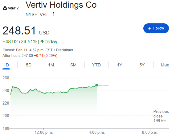 相反,受益于经济加速增长的股票以及涉及AI数据中心建设的股票则录得上涨。数字基础设施提供商维谛技术(Vertiv)在公布第四季度财报超预期并发布强劲的2026年展望后,股价飙升24%。卡特彼勒(Caterpillar)、GE Vernova 和伊顿(Eaton)等公司股价在当日交易中也纷纷走高。