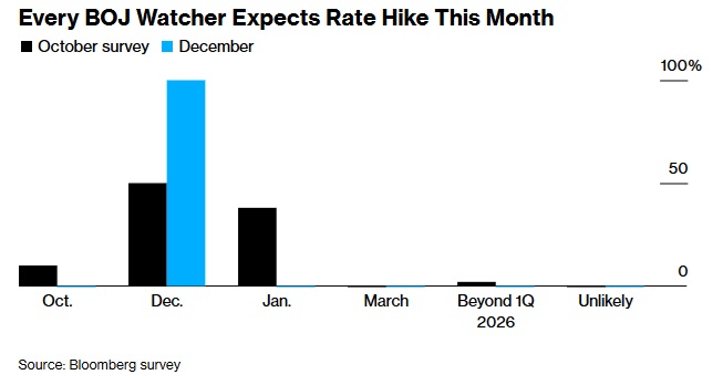 FX168财经报社(亚太)讯 美国彭博社周五(12月12日)最新报道称,据彭博对日本央行观察人士进行的一项调查显示,日本央行将于下周上调政策利率,这是自今年1月以来首次重启加息周期。