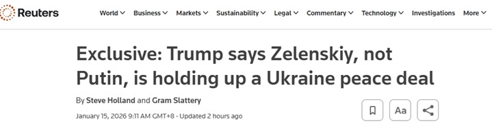 #俄乌战争#FX168财经报社(亚太)讯 英国路透社周四(1月15日)发布独家报道称,美国总统特朗普(Donald Trump)对路透表示,是乌克兰——而非俄罗斯——在拖延一项潜在的和平协议;这一表态与欧洲盟友的说法形成鲜明对比。欧洲盟友一直认为,莫斯科对结束其在乌克兰的战争兴趣不大。