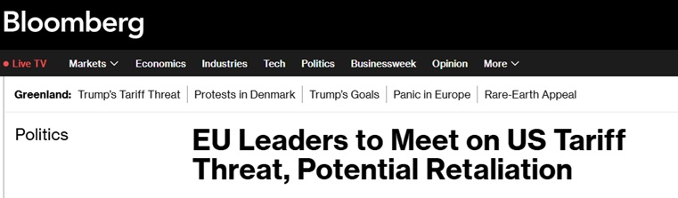 FX168财经报社(亚太)讯 美国彭博社当地时间周日(1月18日)报道称,欧盟领导人将在未来几天举行紧急会议,讨论美国总统特朗普(Donald Trump)最新的关税威胁,并研究可能采取的报复性反制措施。