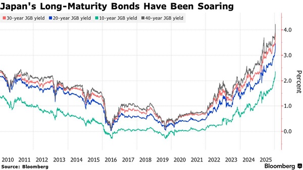 周二东京的交易时段,交易员表示这是近期最混乱的一天。日本30年期和40年期国债的收益率均上涨超过25个基点,这是自美国总统特朗普(Donald Trump)去年发布解放日关税以来,市场波动最大的情况。