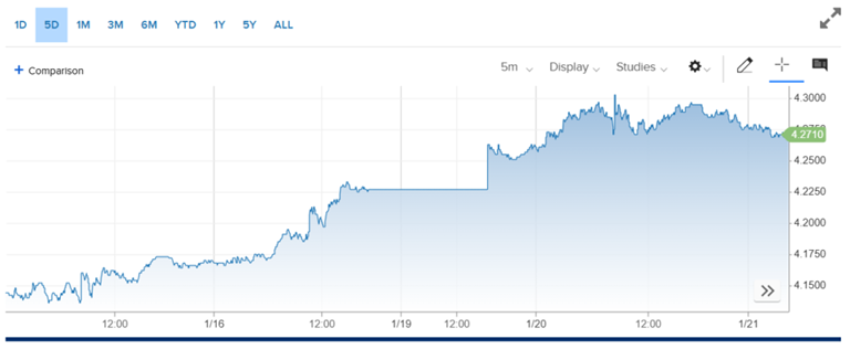 (美国10年期国债收益率5日走势图 来源:CNBC)
