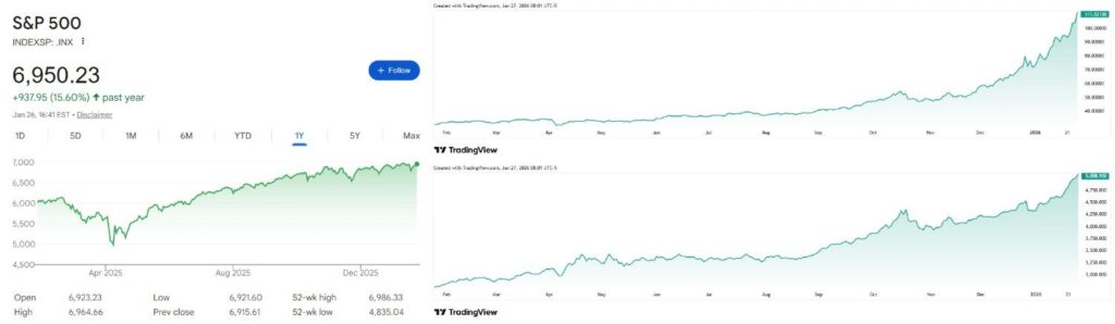 (标普500指数、黄金和白银12个月价格走势图 来源:谷歌和TradingView)