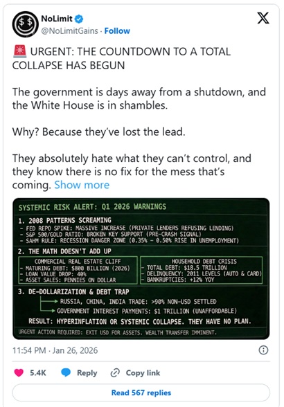 1月26日,NoLimit声称一位与白宫关系密切的朋友向他透露了极其糟糕的消息。随后,他发布了一篇令人担忧的社交媒体帖子,列举了美国乃至全球经济濒临崩溃的诸多原因。