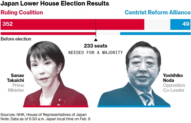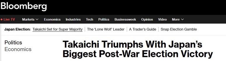 彭博社称,这一选举结果赋予高市早苗推动大胆财政支出计划的授权,而这些计划此前已令投资者感到不安;同时,她也将在国际舞台上采取更为强硬的立场。