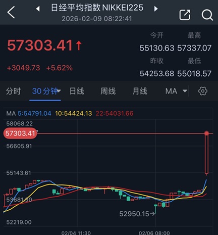 日经225指数盘初涨幅扩大至近6%,刚刚最高触及57337.07点,续创历史新高。