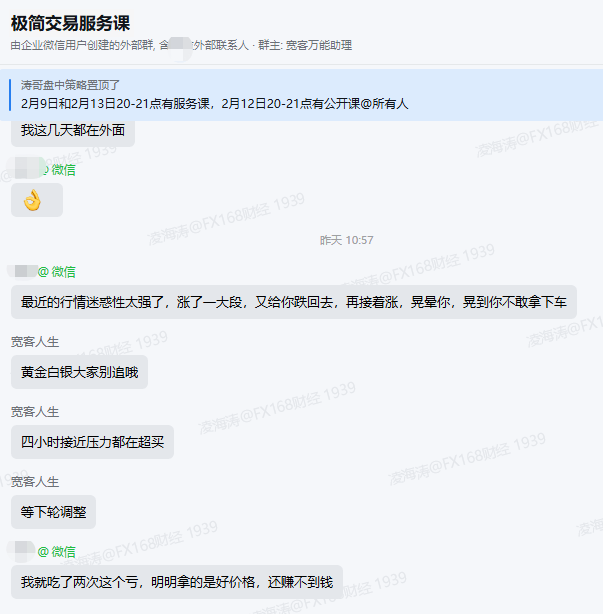 2 月 9 日,黄金、白银市场整体呈现震荡走势,多空交织、方向不够明朗,普通投资者很容易在反复波动中迷失节奏。面对这样的行情,宽客老师第一时间在学习群里给出专业提醒,叮嘱大家近期操作贵金属一定要保持谨慎,不要盲目入场,耐心等待清晰、明确的信号再行动,把风险控制放在最前面。