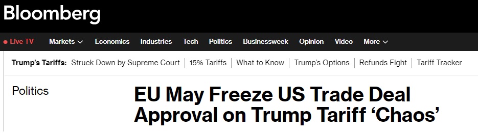 欧洲议会此次转向发生在这样的背景下:美国最高法院上周五裁定,特朗普援引一项紧急权力法律、对全球加征其所谓“对等关税”的做法不成立。