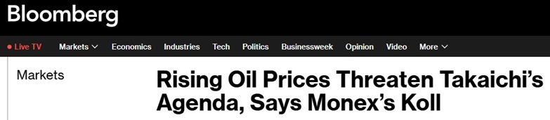 Koll表示,这将使高市早苗的施政议程面临风险,“因为她向日本民众承诺会让能源和食品通胀降下来”。