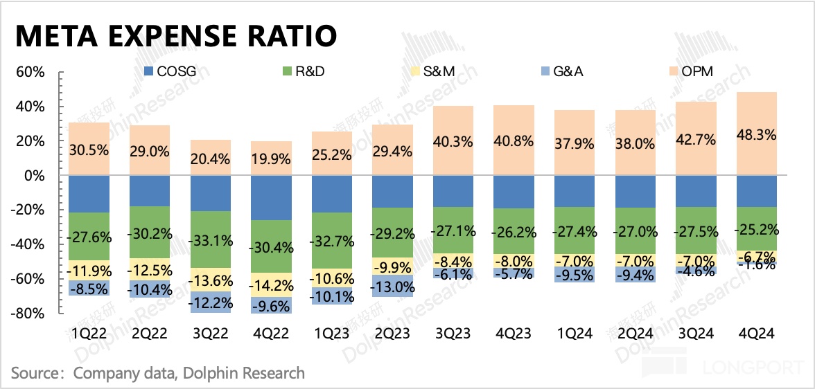 另一方面,Meta 仍然在控制费用。环比上季度来看,如果剔除法务费用计回的影响,Q4 经营费用合计增长了 10%,除了研发费用相对较高外,管理、销售费用都几乎与去年同期持平。最终经营利润率环比提升了 6pct,其中 3pct 来自法务费用计回。